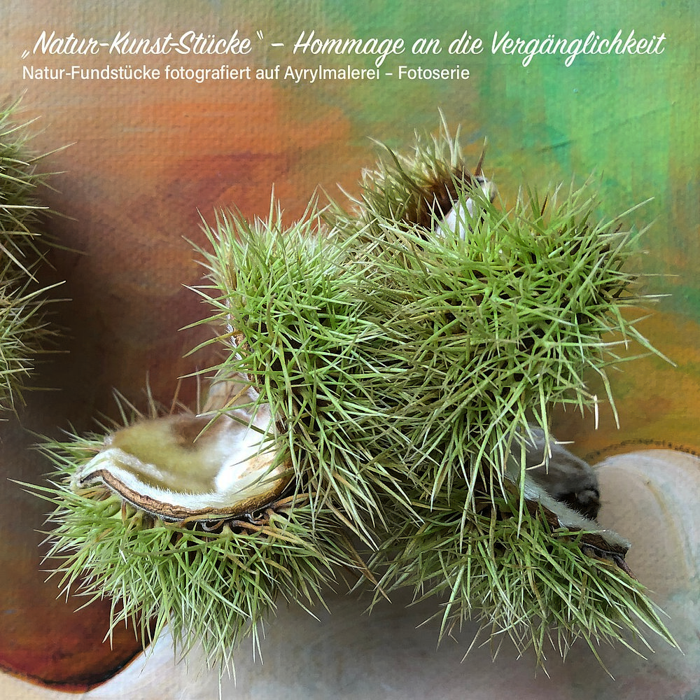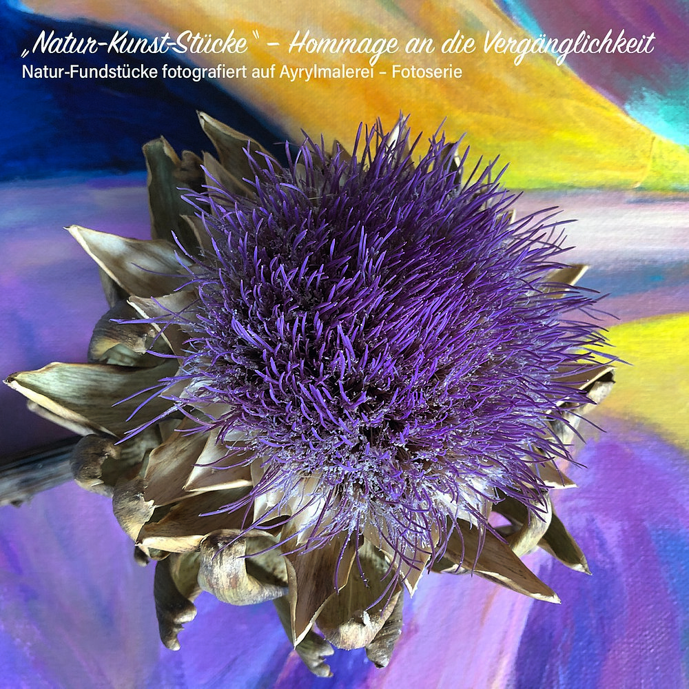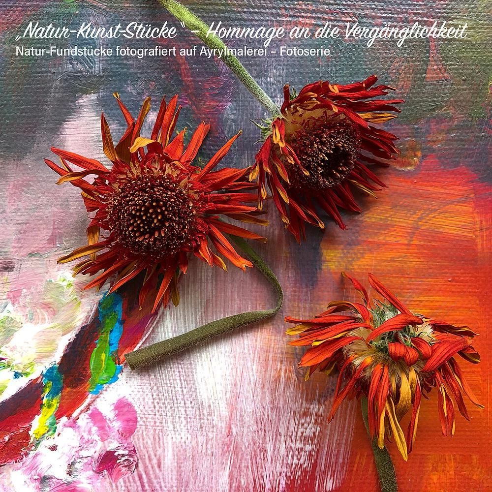 Die Geschichte zu dieser Bilderserie beginnt in meinem Wohnzimmer. Meine Nachbarin schenkte mir eine Sonnenblume, die ich vor mein Bild an der Wand stellte. Leider vertrocknete sie durch meine geringe Pflege. Bei genauem Hinsehen habe ich entdeckt, wie wunderschön und facettenreich sich die Blume in ihrer Vergänglichkeit gezeigt und sich mit dem Bild auf fantastische Weise verbunden hat. Seitdem sammele ich bei meinen morgendlichen Spaziergängen begeistert Naturfundstücke und kombiniere sie mit meiner Malerei. Wahre NATUR-KUNST-STÜCKE.