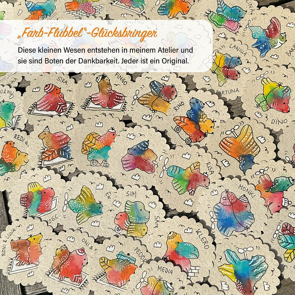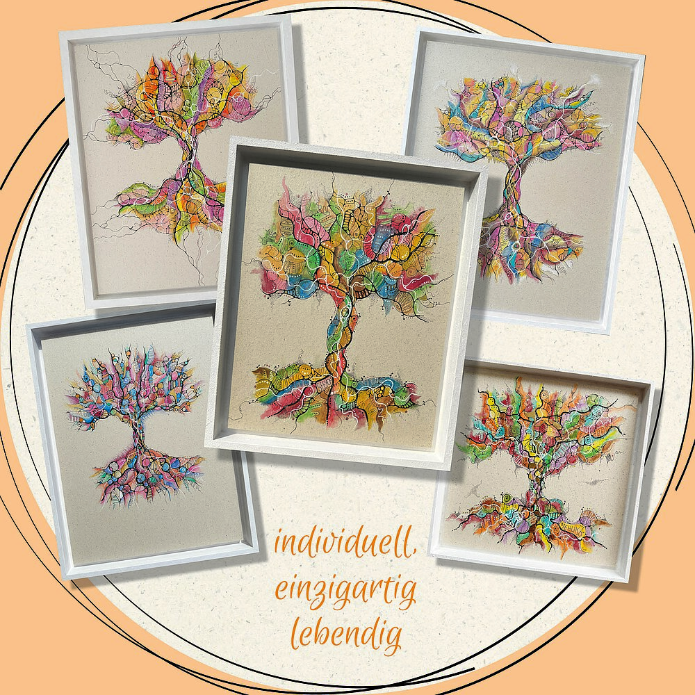 Als Grafikerin gehören Illustrationen zu meinem Business und ich hatte immer schon Freude daran. Diese Werke, die hier zu sehen sind, sind jedoch entstanden, dadurch, dass ich eigene Mandalas gemalt habe und meine Freundin mich auf "Neurographik" aufmerksam machte, eine kreative Transformationsmethode, die ich fortan mit Begeisterung genutzt habe, um Themen für mich zu malen/zeichnen. Daraus ist nun mein ganz eigener Stil entstanden, der sich in meinen energetischen Seelenbäumen und in meinen "Farb-Flubble"-Glücksbringern zeigt.